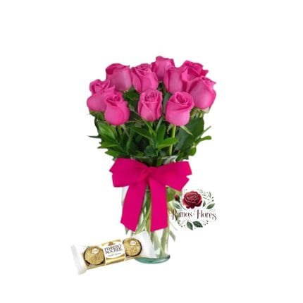 Ramo 12 Rosas Rosadas + Bombones Ferrero + Globo