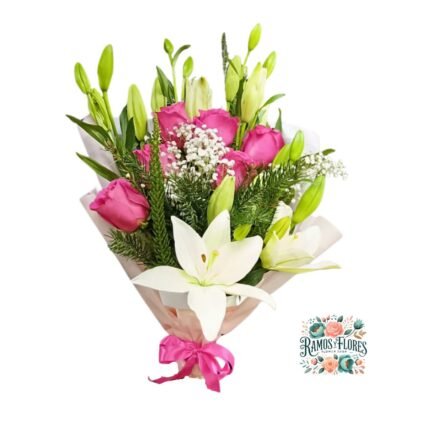 Arreglo 12 Rosas Fucsias + 7 Gerberas Fucsias + Lirios