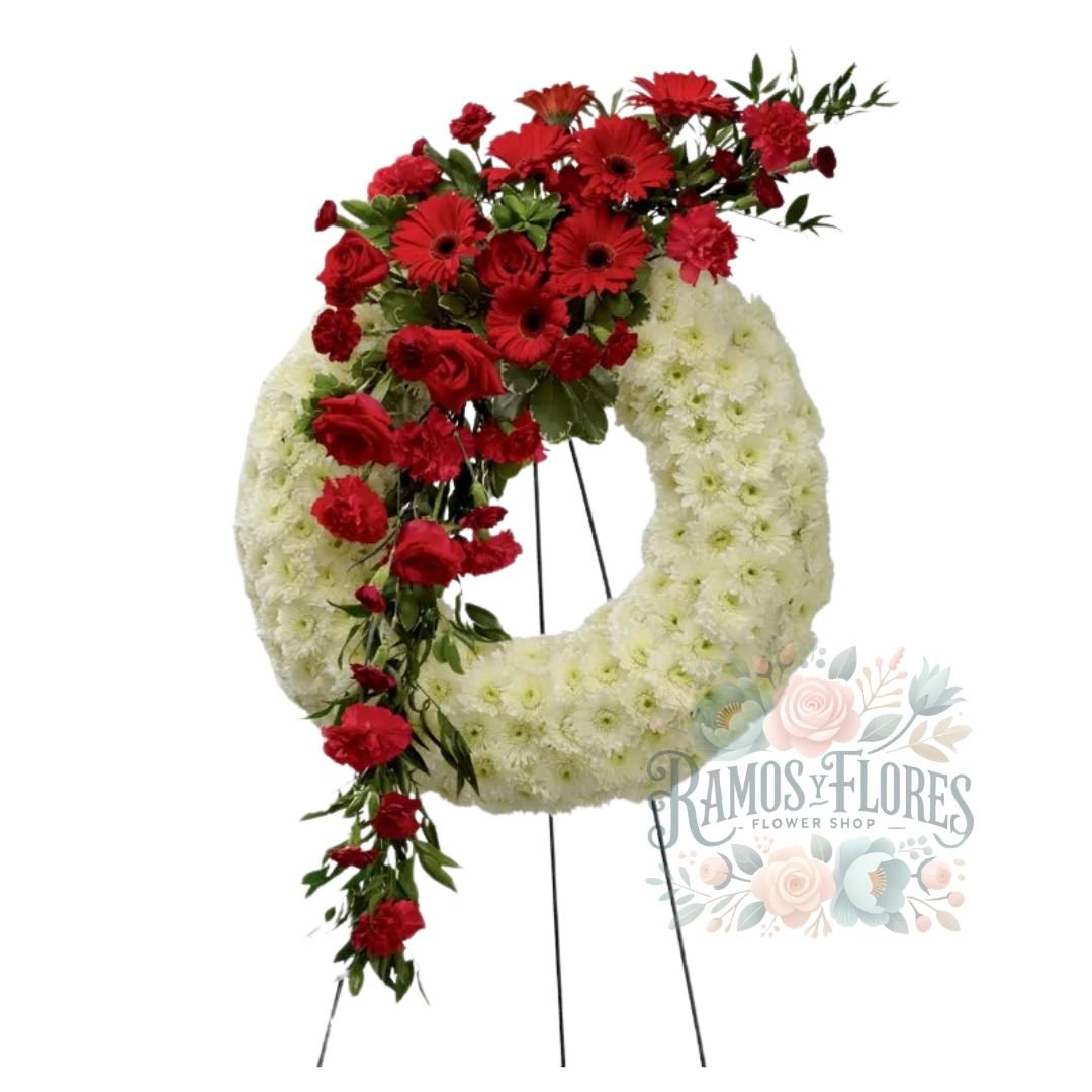 Corona de Rosas + Claveles + Gerberas Rojas + Hermoso Maule + Atril (este arreglo ya incluye su base).