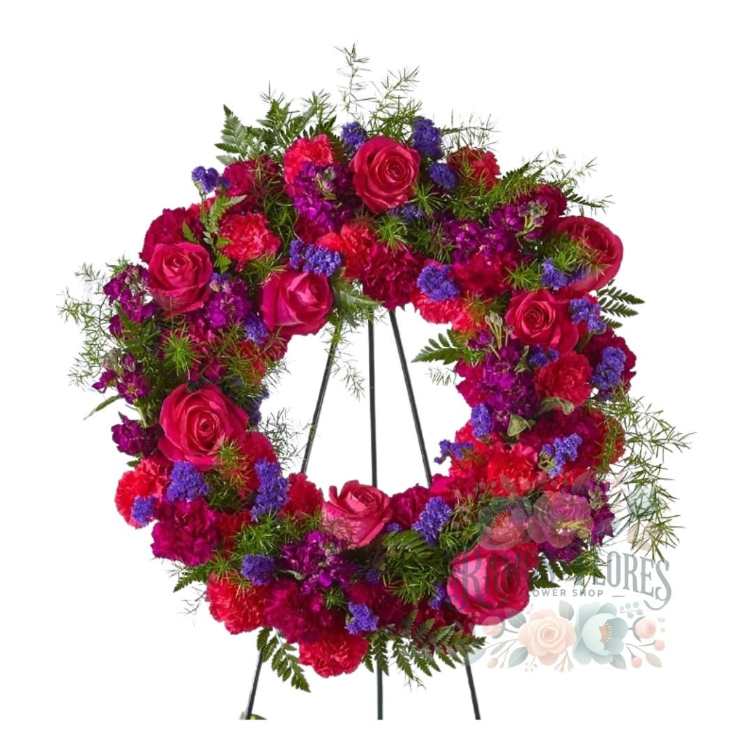 Corona de Rosas + Claveles + Statice + Atril (este arreglo ya incluye su base).