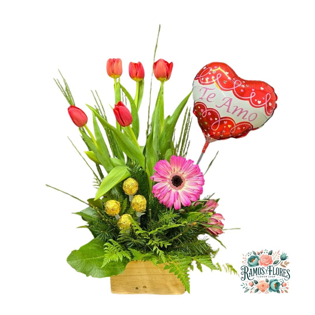 Arreglo 5 Tulipanes + Gerbera + 4 Bombones