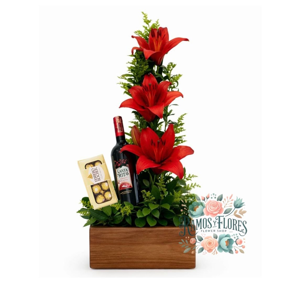 Arreglo De Lirios + Bombones Ferrero 8 unid + Botella Vino