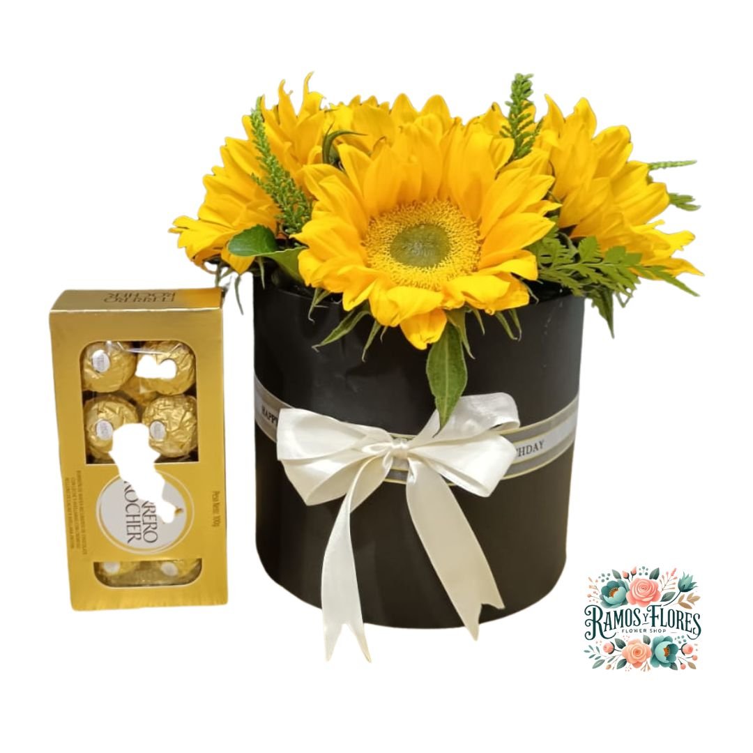 Box Cilindro 6 Girasoles + Bombones Ferrero 8 unidades