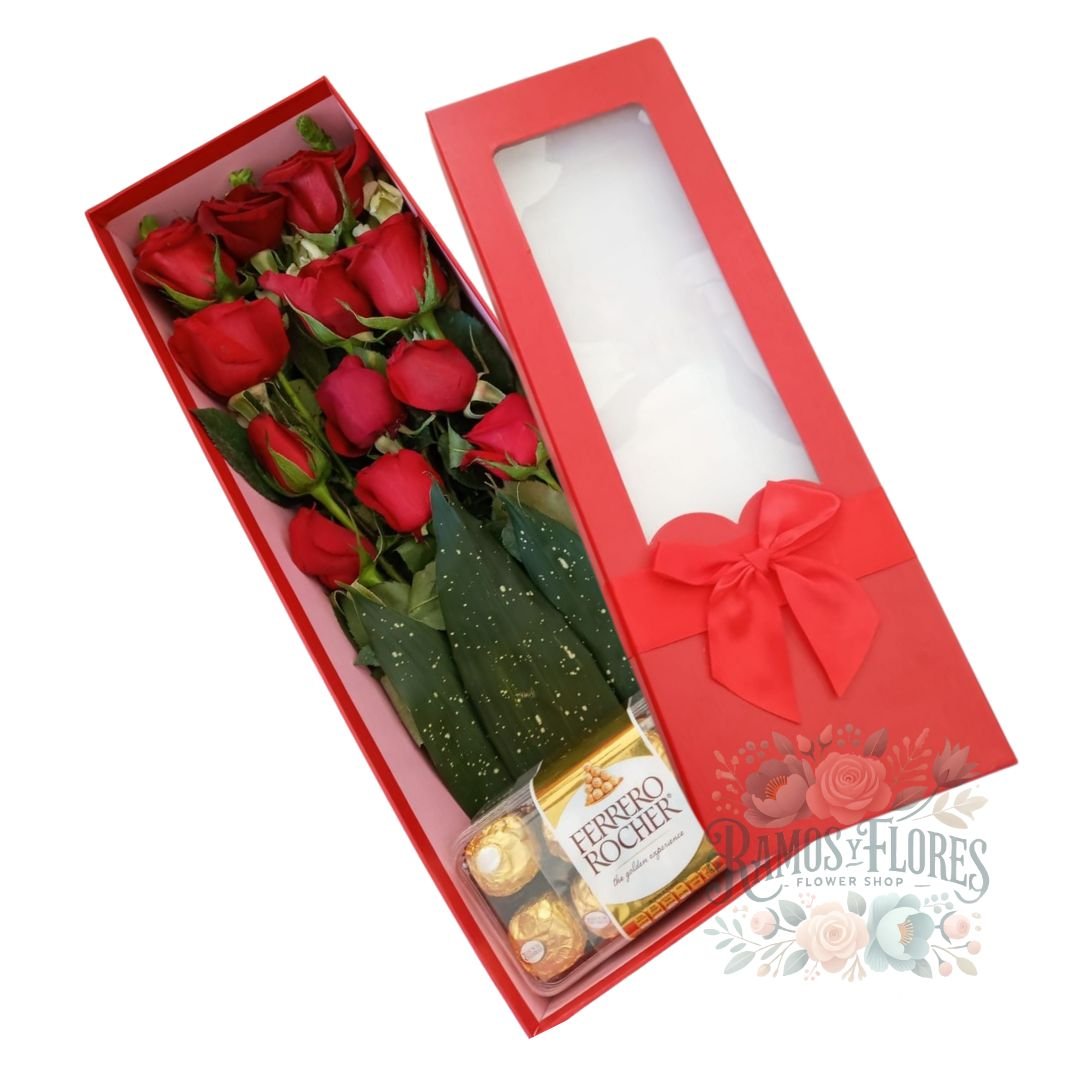 Caja 12 Rosas + Bombones Ferrero 8 unid.