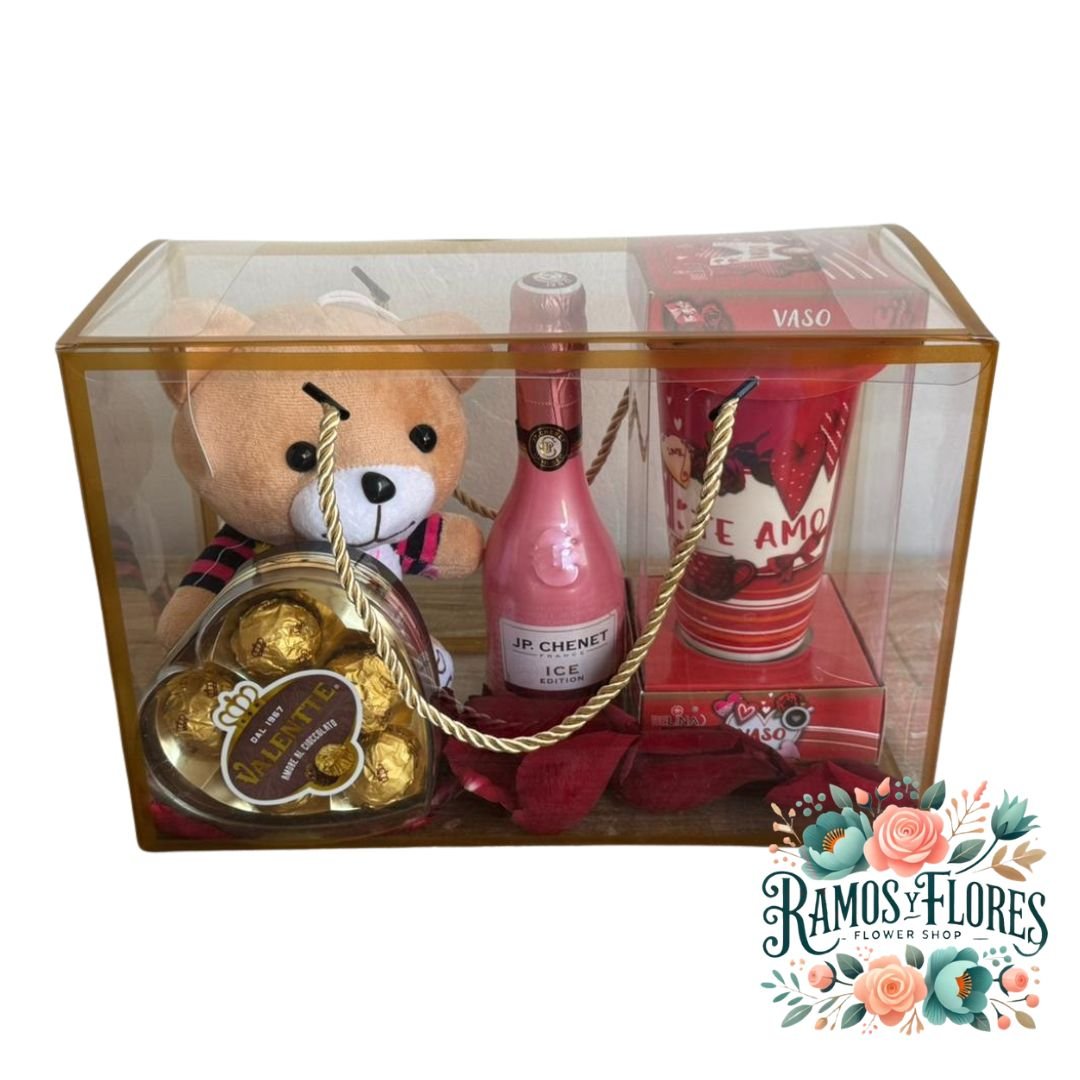 Caja de PVC dorada + Peluche + Caja De Bombones 5 unid. + Espumante Jp Chenet Rose + Vaso De Cerámica Mug
